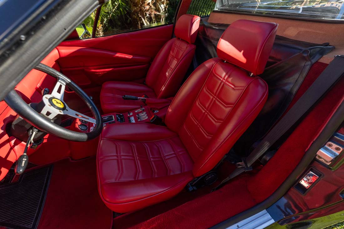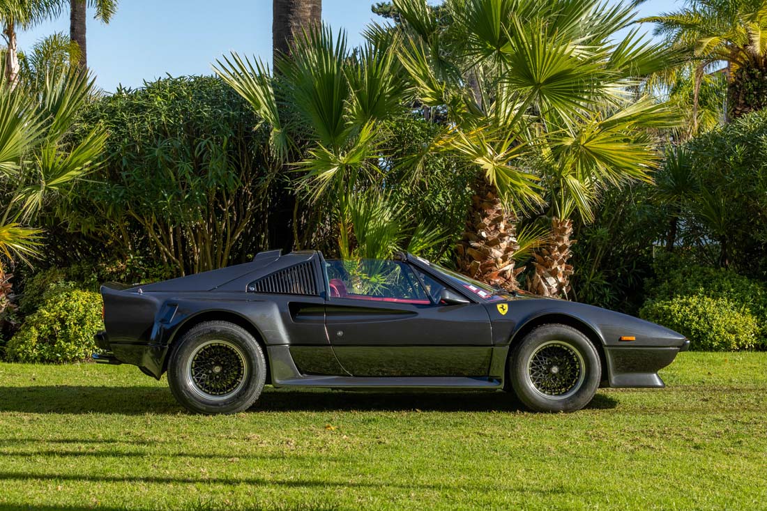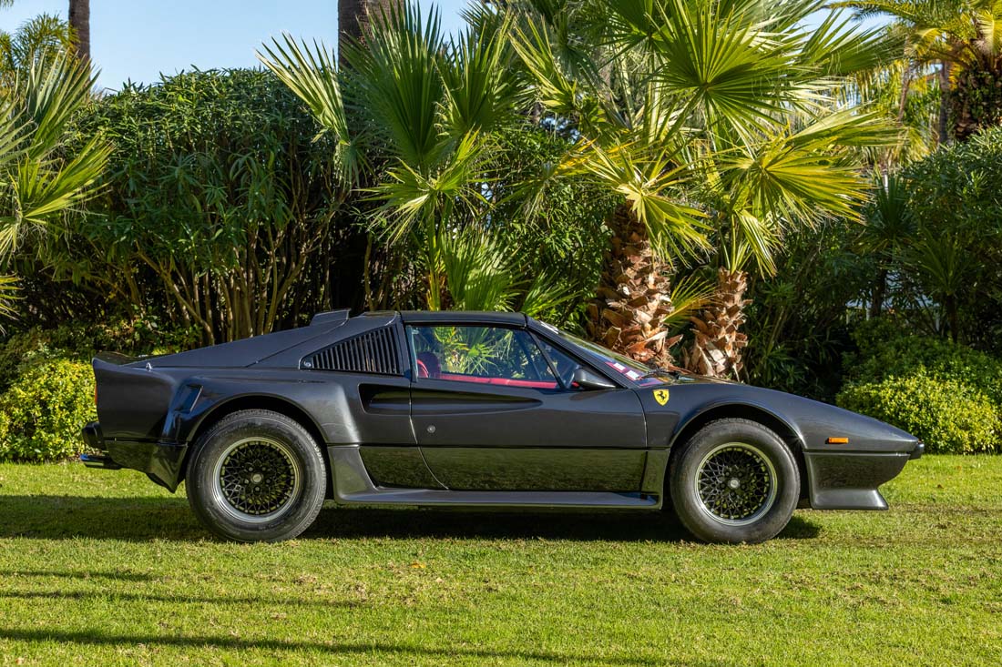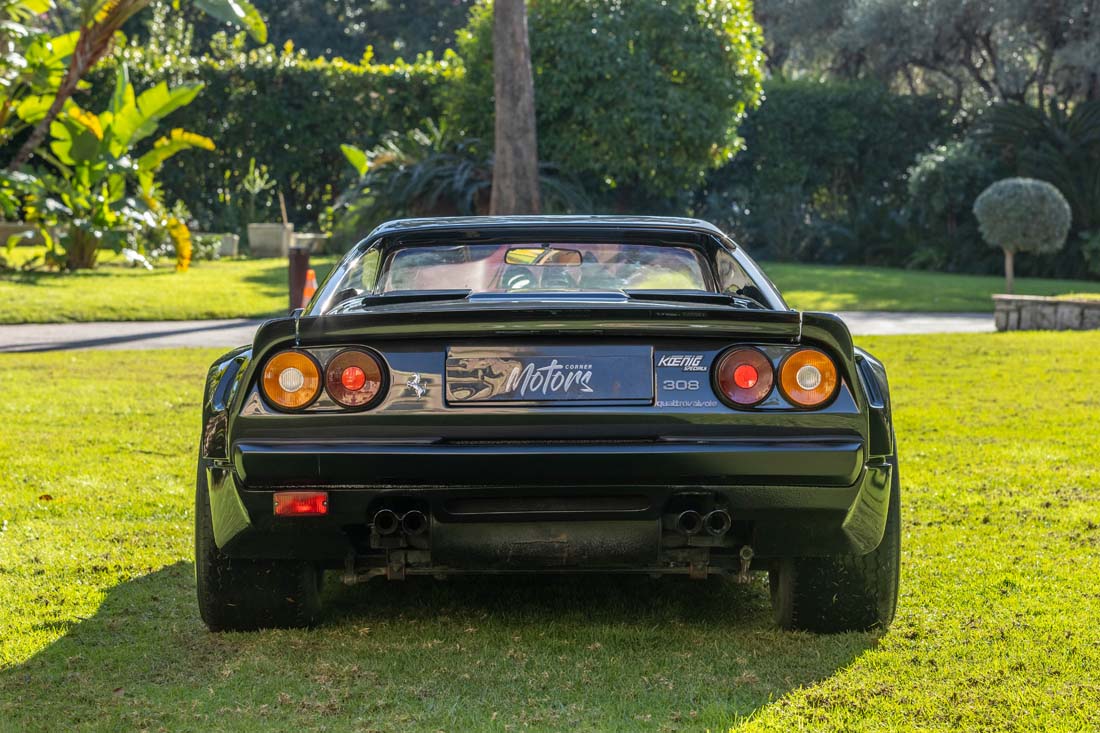 Cette Ferrari 308 est équipée du rare kit carrosserie koenig lui conférant une allure radicale et musclée. La planéité de tous les éléments de carrosserie est excellente, aucun affaissement ni déformation ne sont à signaler. La peinture est d’excellente qualitée. De plus, elle dispose de jantes BBS en parfait état.