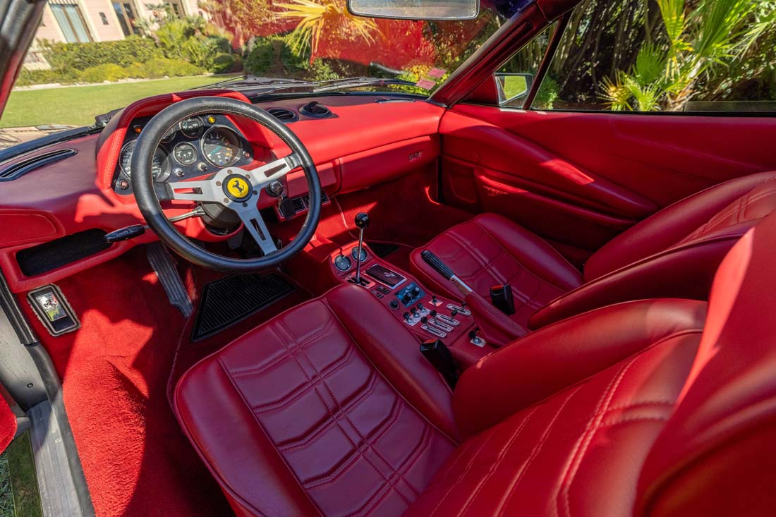 L’habitacle est une véritable capsule temporelle. La configuration full cuir rouge (sièges, contre-portes, console centrale) est entièrement restaurée dans le respect de sa configuration et qualité d’origine, tous les instruments de bord sont fonctionnels.