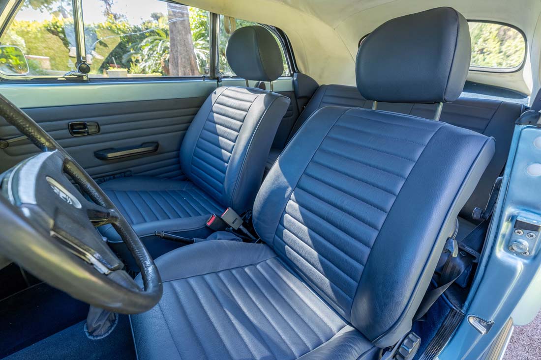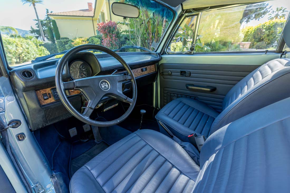 L'habitacle est dans un très bel état. Les sièges avant baquets ainsi que la banquette arrière sont recouverts d'un simili cuir bleu ardoise en très bel état, sans usure ni craquelure visible. Les appuie-têtes sont assortis. Les panneaux de portes gris clair avec inserts bois sont propres et homogènes. Le volant trois branches est d'époque et en bon état. La moquette bleue est propre. Le coffre avant est tapissé de moquette noire.