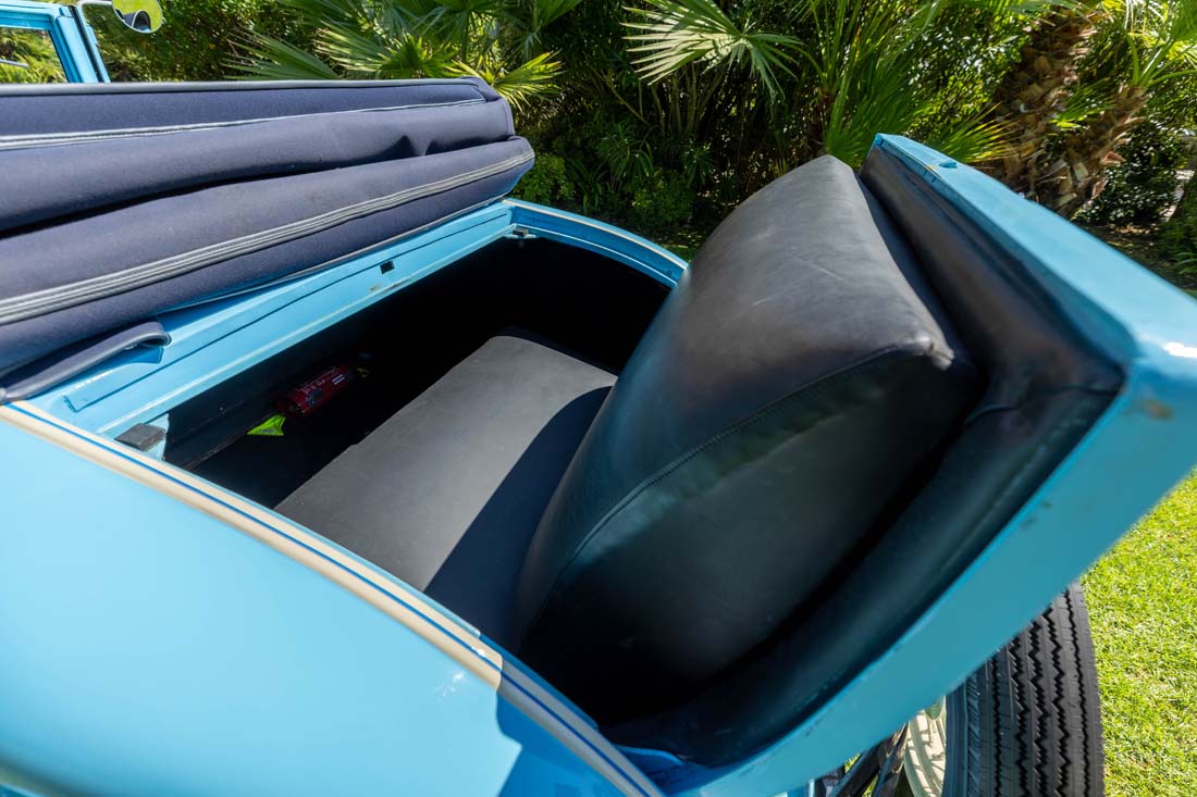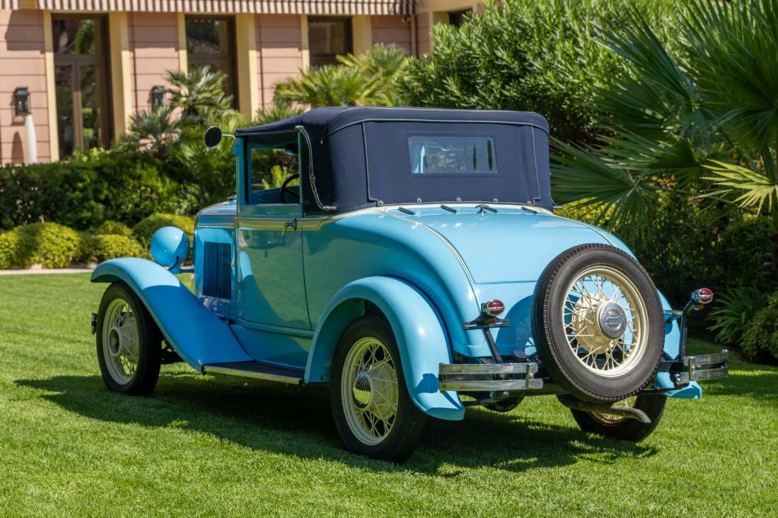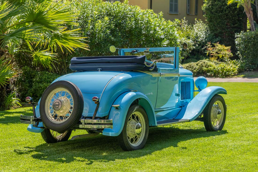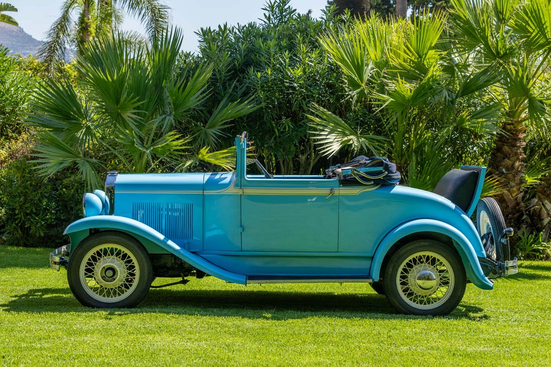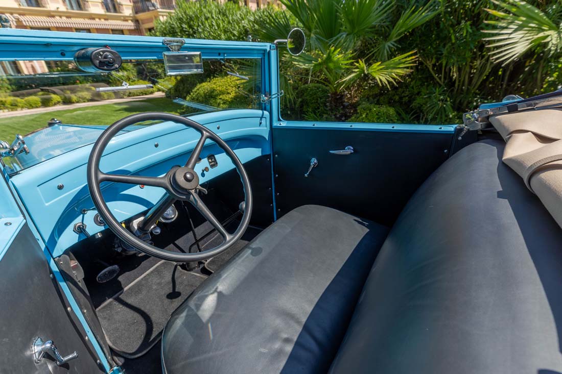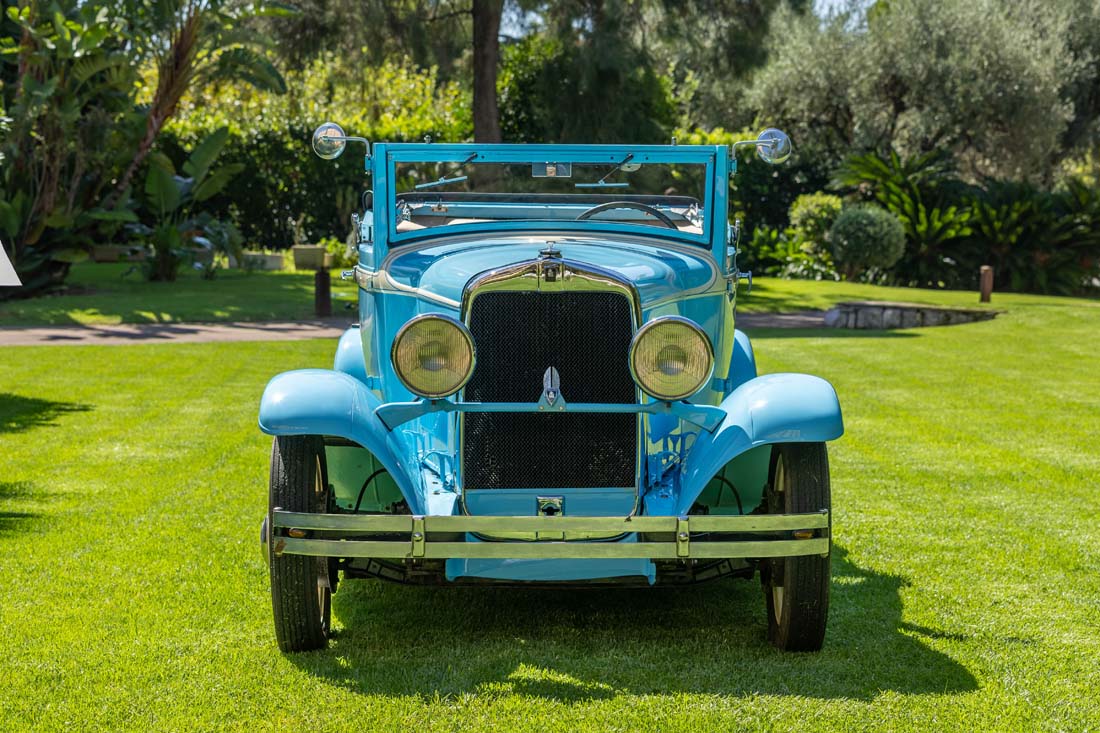 La carrosserie, intégralement restaurée, se présente dans une teinte bleue éclatante qui souligne les lignes fluides et typiquement américaines des années 30. La capote en toile bleue marine est neuve et parfaitement ajustée. Les chromes, les phares et les pare-chocs affichent un brillant impeccable. Les jantes à rayons, chaussées de pneus récents, complètent cette présentation soignée et mettent en valeur l’élégance intemporelle du cabriolet.