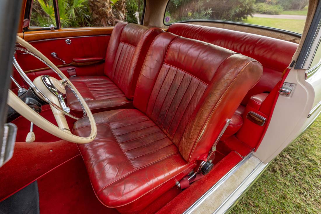 L’habitacle est entièrement d’origine et nous plonge dans un univers unique. Jamais restauré la sellerie en cuir rouge présente une patine sublime, témoignage d’une qualité d’antan.