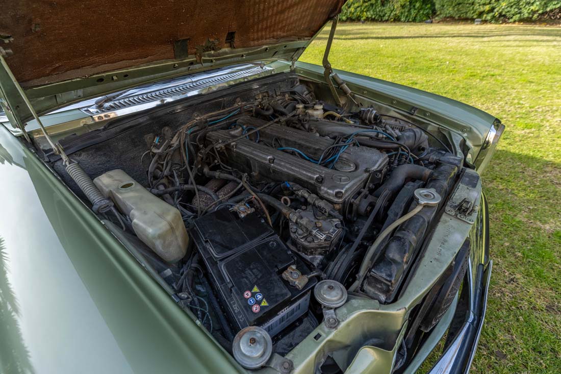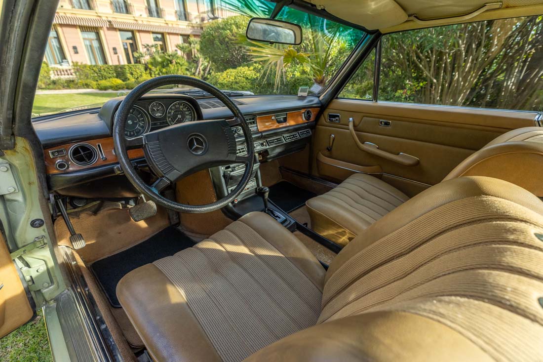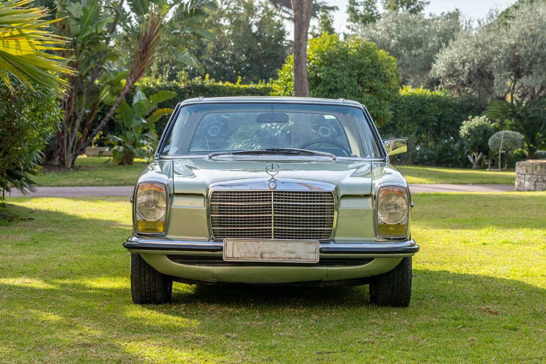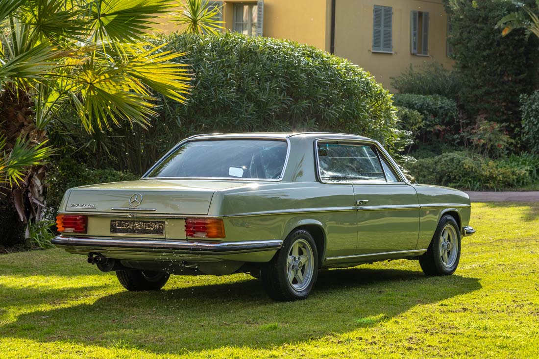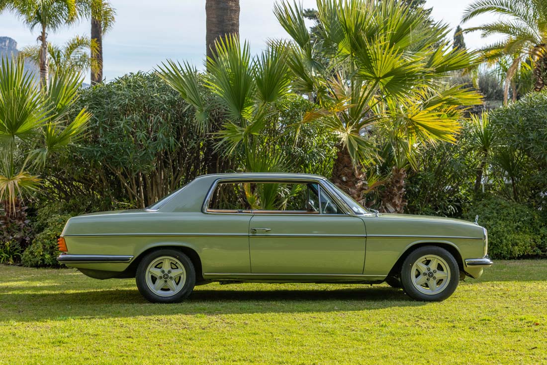 La carrosserie est très belle. La teinte vert clair métallisé met parfaitement en valeur les lignes tendues et élégantes du coupé W114. Les alignements sont bons. Les chromes, la calandre, entourages de vitres, pare-chocs sont bien conservés.