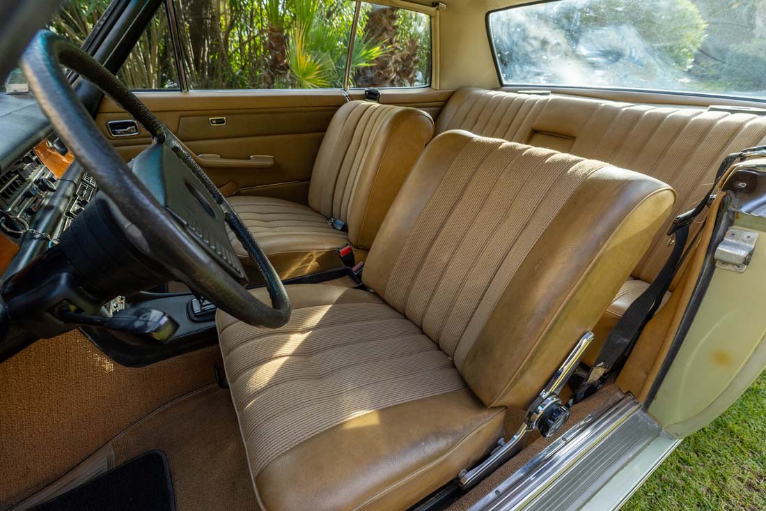 L’habitacle présente une très belle configuration d’origine, dans une élégante combinaison typique des années 70. La sellerie en ton beige / tabac est bien conservée avec une usure en accord avec l’âge mais sans défaut majeur.