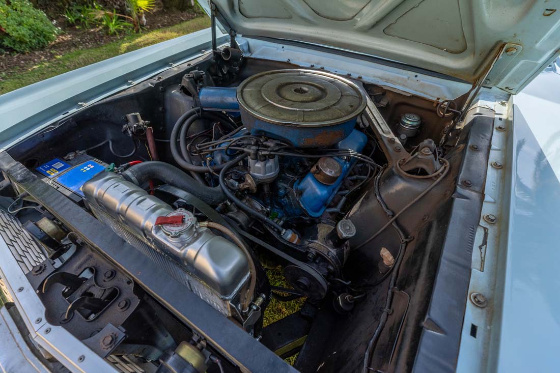 Sous le capot, on retrouve le V8 289 ci Code C dans sa configuration d'origine, reconnaissable à ses cache-culbuteurs bleus typiques Ford. La voiture vient de faire l'objet d'une révision mécanique complète. Le moteur tourne bien, délivre sa puissance sans à-coups et la boîte automatique passe les rapports en douceur.