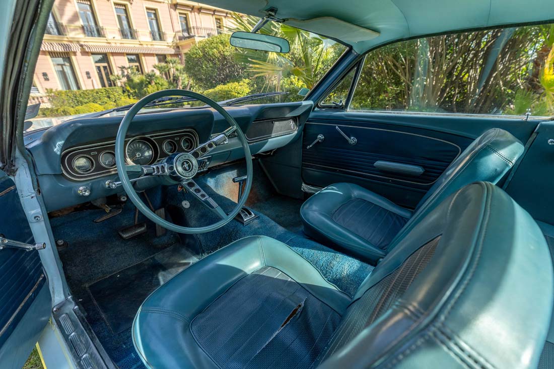 Cette Mustang est présentée dans sa teinte d'origine Arcadian Blue, en bon état général. Un polish complet a récemment été réalisé sur l'ensemble de la carrosserie. Les pare-chocs avant et arrière, la calandre avec son cheval cabré central, ainsi que les éléments chromés sont bien conservés. La voiture est montée sur des jantes acier d'origine chaussées de pneus à filet blanc, conformes à la configuration de sortie d'usine.