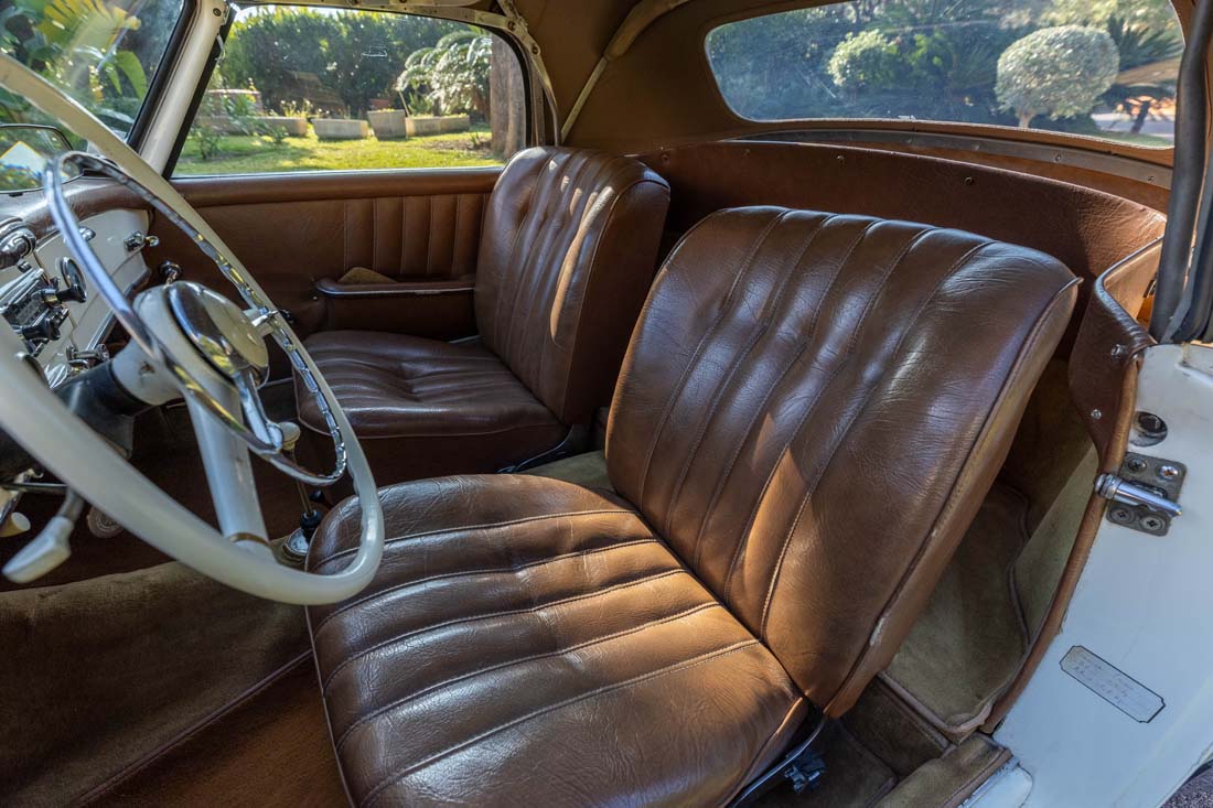 Le tableau de bord est bien conservé avec son instrumentation d’origine et son large volant ivoire. Les moquettes et garnitures intérieures restent cohérentes avec l’âge et la restauration de la voiture, offrant une très belle présentation.