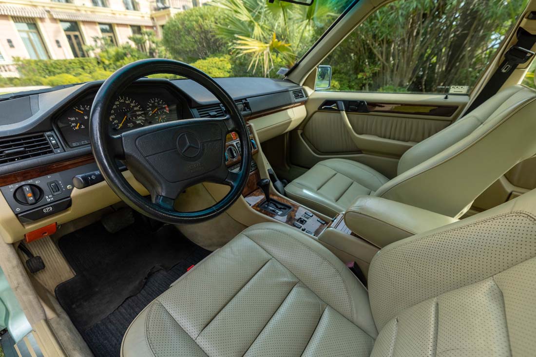 L'habitacle dispose de quatre sièges en cuir beige (chauffants à l'avant) en parfait état. La console centrale et le tableau de bord sont vraiment bien conservés. La boiserie spécifique des années 90 reflète la qualité.