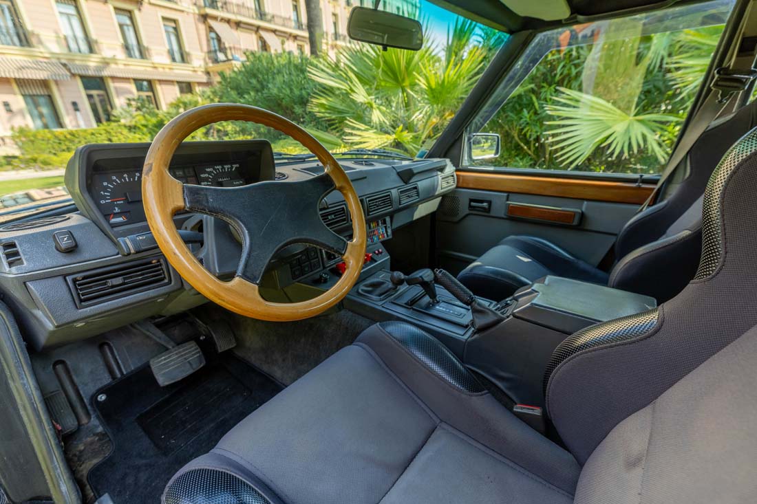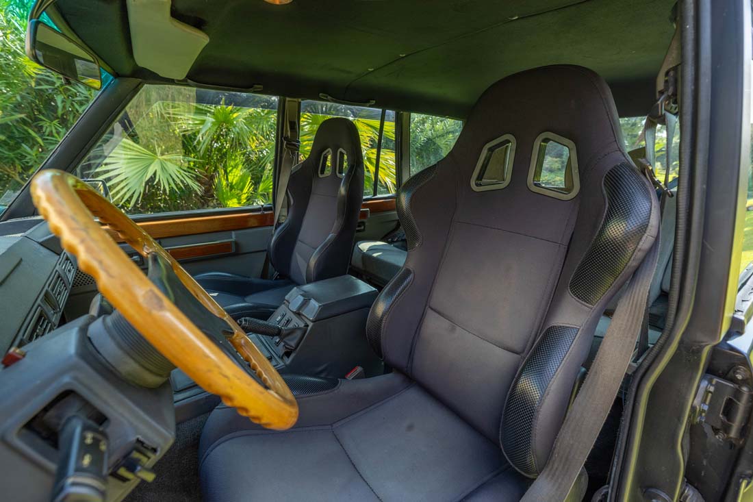 L’habitacle présente un bon état général. Un volant en bois a été installé, ainsi que des sièges baquets offrant un meilleur maintien en conduite tout-terrain.